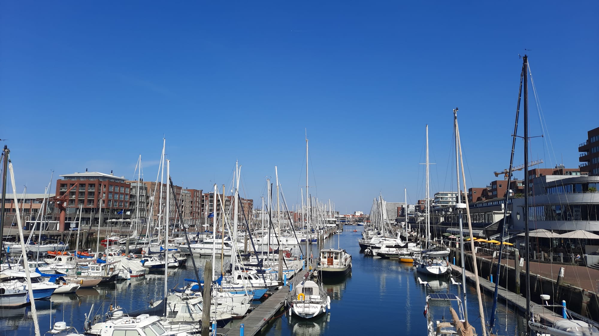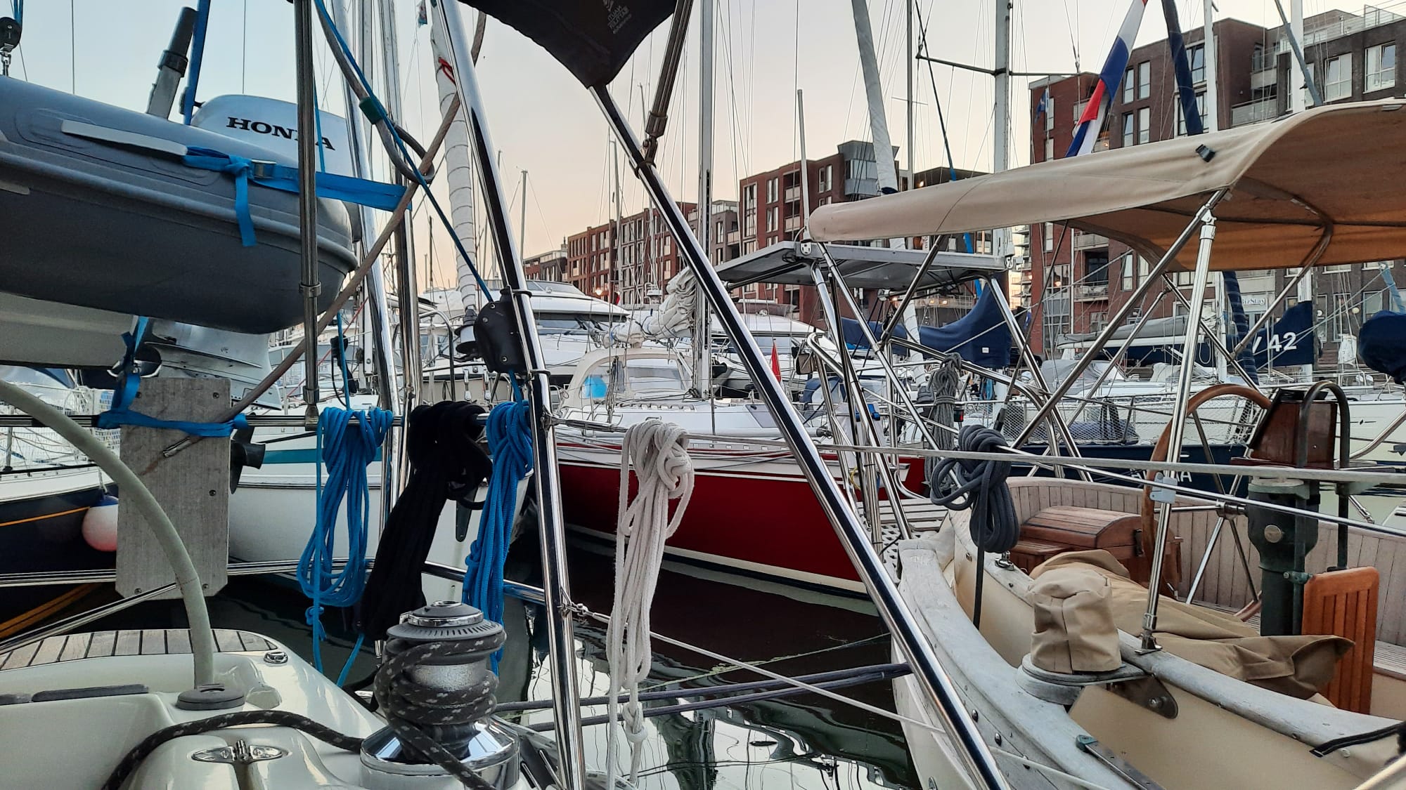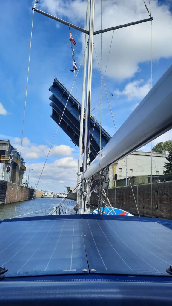 Vandaag moeten we door de Haringvlietbrug, welke draait op het hele uur. Er zijn tussen de 12 en 25 knopen voorspeld, dus dat moet alleen op de fok lukken. Dat is fijn, want Pieters rug speelt ‘m nog steeds parten (flink paracetamol slikken en maar hopen op betere tijden). Geluk bij een ‘ongeluk’ ik kan meer aan de bak 😁. Tijdens de tocht staat er voornamelijk windkracht 5/6 (ca 22 knopen) en we gaan als een speer vooruit, gem. 6,5 knoop. Ons doel is de Marina Cape Helius in Hellevoetsluis, waar ons een gratis overnachting te wachten staat i.v.m. een volle spaarkaart! 😇 wel nog even de toeristenbelasting afdragen 🤔 Morgen willen we dan door naar Scheveningen. Tijdens de afwas (ja ja op de hand 😉) vraagt Miranda of de Goerese sluis wel in bedrijf is, bij wijze van grapje. We hebben hier namelijk ooit een keer toen we richting de Engelse kust wilden voor dubbel rood gelegen (sluis gestremd!). Het stemt Pieter toch tot nadenken want een poosje later hoor ik.. oooh nee!!!! Wat dan? De sluis is morgen van 07.00 tot 18.00 uur niet in werking. Nee joh, dat meen je…maar even bellen met de sluiswachter. Ja mijnheer dat klopt krijgt Pieter te horen, om 07.00 uur ligt de boel stil, als ik u was zou ik rond 06.00 uur hier zijn om er zeker van te zijn met een schutting mee te kunnen, ik heb namelijk al meer telefoontjes binnengekregen! Pfff… wat begon als grapje, is nu serieus, wat een geluk dat we dit nu weten anders hadden we weer voor een dichte (sluis)deur gestaan.😅