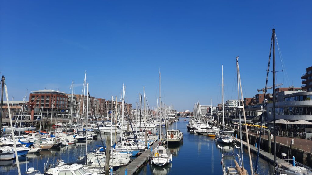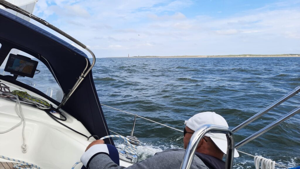 De wekker loopt om 04.30 uur af, we willen om 05.00 uur vertrekken in het donker!! Direct voor de haven ligt een strekdam en die moeten we uiteraard niet over het hoofd zien. Zodra onze slaperige ogen beetje aan de donkerte gewend zijn, zie je steeds meer/beter. Pieter weet de Bateleur zonder kleerscheuren richting de Goereese sluis te varen. We zijn niet de enigen, er liggen zeker al 5 schepen te wachten. De schutting verloopt lekker vlot en om 06.49 uur is de zon ook op 🙂. Via een slingerroute gaan we het Slijkgat uit. We hebben het grootzeil uitgerold maar dat voegt niet veel toe, er staat niet veel wind. Zodra we het gat uit zijn, rolt de boot van links naar recht op de golven, het lijkt wel of we in een wastobbe zitten..pfff… dat word je snel zat. Zodra we aan het begin van de Maasmond zitten, wordt het gelukkig wat minder. De scheepvaart hindert ons niet en dat betekent dat we met ruim 2 knopen stroom mee goed opschieten en al rond 11.00 uur in Scheveningen kunnen aanmeren.