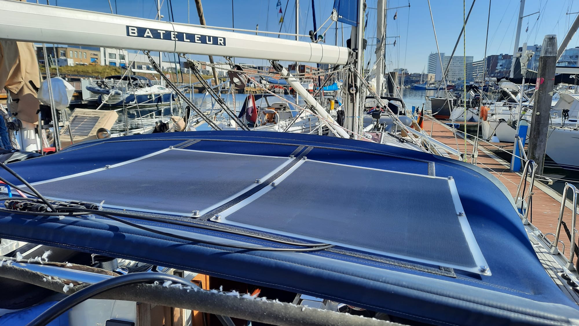 We liggen te wachten op een goede wind om naar Scheveningen te gaan. Een paar weken geleden hebben namelijk de Chinese flexibele zonnepanelen het begeven. En omdat Pieter niet nogmaals rotzooi wil kopen, heeft hij zich verdiept in DE beste 😊 én omdat hij niet van halve maatregelen houdt, deze ook maar gelijk besteld bij de watersportzaak in Scheveningen. Kortom, we hebben een missie. Alleen het weer werkt niet erg mee, een pittige wind teistert ons land, met name langs de kust. Op zich komt ons dat niet ongelegen want Pieter heeft waarschijnlijk een verkeerde draai gemaakt waardoor hij hevige pijn in de onderrug ervaart. Wanneer hij niet meer weet hoe te zitten of staan, gaat hij maar weer liggen.