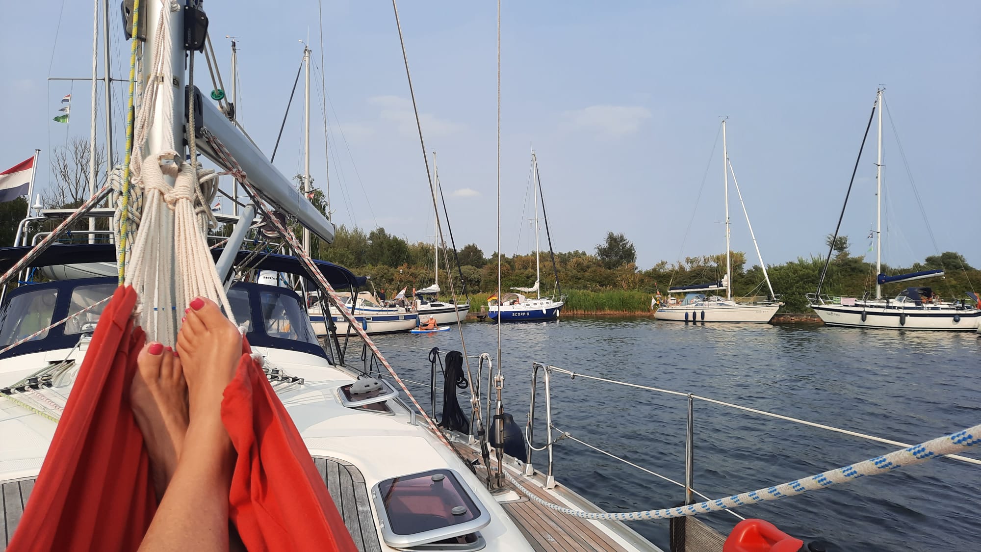 Na een kort tochtje weten we een plekje op het onbewoonde eiland Stampersplaat te bemachtigen, wat een mazzel. Het is een komen en gaan van bootjes, altijd leuk om te kijken. Einde middag snor ik de hangmat op die al jaren ongebruikt in het plastic ligt te verstoffen, dat is toch eeuwig zonde en het wordt hoog tijd dat ik deze ga uitproberen. Ik kan je vertellen dat erin kruipen nog een hele kunst is, het doek is niet heel breed en zakt behoorlijk naar beneden als je erin stapt. MAAR als je er éénmaal in ligt is het heel rustgevend, wat ontbreekt is dat er iemand naast je staat en je steeds een duwtje geeft zodat je lekker heen en weer blijft schommelen 😉.
