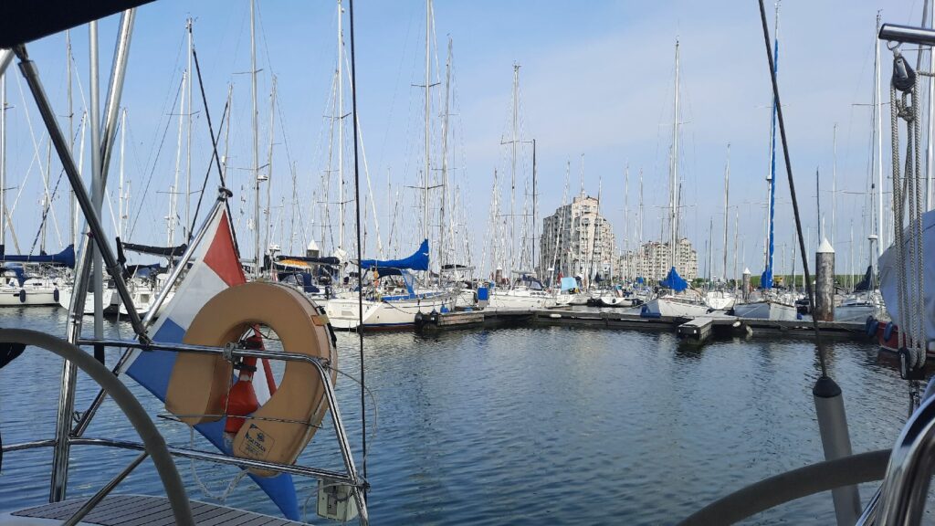 Het is tropisch warm, we hebben ons dik ingesmeerd en petten en zonnebrillen op. Eigenlijk hadden we de bimini (het zonnedak moeten uitklappen), volgende keer beter voorbereiden nemen wij ons voor. In ca 2 uurtjes in totaal zijn we in Breskens. Wanneer wij net zijn aangemeerd komt het eerdergenoemde jacht aangevaren en ramt bij het invaren van de naast ons gelegen box, de vingersteiger. Aan een lijn die ik van hen aanpak, help ik de boot mede verder de box in. De mevrouw verontschuldigt zich met een: het is allemaal weer even wennen voor ons. Natuurlijk! 🙂 De mijnheer is helemaal hyper en loopt Pieter op de steiger bijna omver. Pieter verzekert mij als wij zo omgaan met de boot t.z.t. dan stopt hij er direct mee en met deze mijnheer hoeft hij geen contact. Oke…