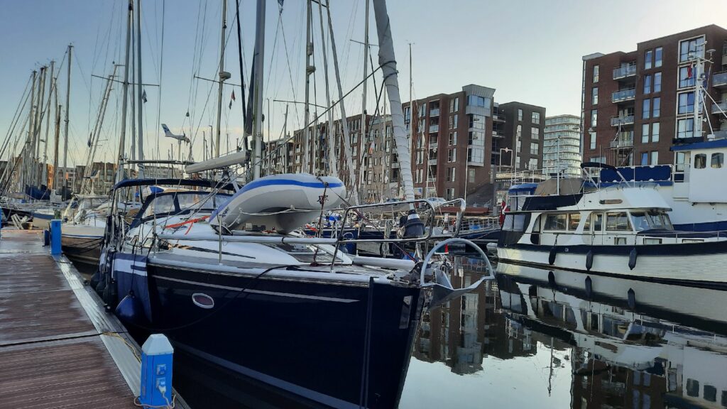 De buren die als eerste bij ons langszij liggen komen terug van hun etentje. We informeren hen over ons vroege vertrek. Dat kan zegt de mevrouw, maar de schipper is niet heel enthousiast omdat hij al meer nachten niet heel best heeft geslapen. Hij heeft een ‘dikke’ boot met een boeg-, en hekschroef waarmee hij zijn boot heel simpel zijwaarts kan verplaatsen. Aan zijn boot is nog een boot afgemeerd, zo gaat dat in Scheveningen, maar deze mensen zijn er niet. Hij stelt voor om beide boten, die dus met lijnen aan elkaar verbonden zijn, tezamen te verplaatsen eerst zijwaarts want direct achter hem ligt nog een boot en dan naar achteren waar nog plek is voor 2 schepen. Wij kunnen dan morgen makkelijk vertrekken en hij hoeft zijn bed niet uit. Hij is nogal overtuigd van zijn idee en begint met zijn voorbereiding. Wij kijken in eerste instantie wat sceptisch toe, een boot verplaatsen van een ander die niet aanwezig is, dat is ook zowat….??