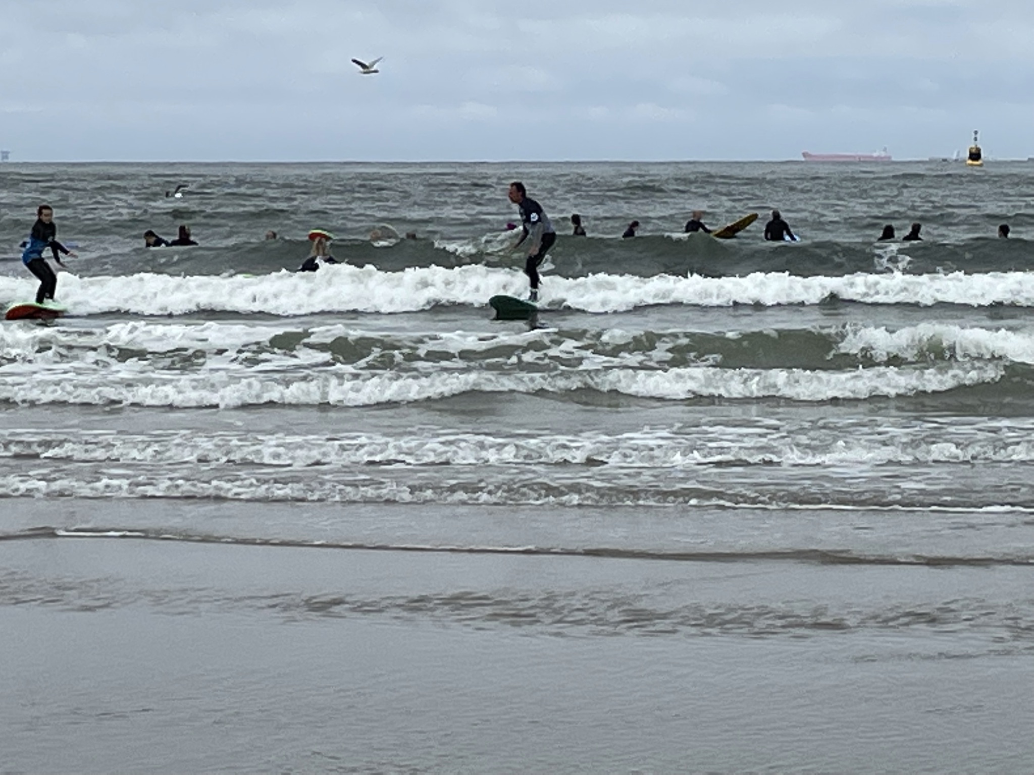 Om ons hoofd te legen (ha ha) gaan we, nadat een collega van Pieter een kijkje op de boot is komen nemen, tegen 13.00 uur op een elektrische scooter richting de boulevard. Op de boulevard laten we de scooter achter. Hier wordt druk geoefend in surfen. Leuk om te zien.