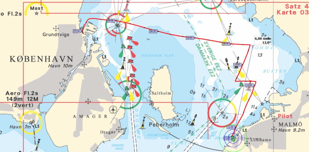 Nee hoor Miranda scoort een ruime voldoende. Heel goed het overige scheepvaart verkeer in de gaten gehouden. Onze eigen zeilvoering en zeker niet onbelangrijk de ondiepere gebieden die overal in Denemarken op de loer liggen. Zo hebben we dat deze trip ook gemerkt aan een hulp oproep (in marifoon termen een PAN PAN PAN bericht) van een Duits zeiljacht dat aan de grond gelopen was. Nadat zij hun positie hadden doorgeven, bleek de afstand voor ons te groot om enige en mogelijke assistentie te verlenen. Andere schepen en de Zweedse kustwacht boden hulp. Na ongeveer 2 uur kwam het bericht dat het schip losgekomen was en schip en bemanning oké. Altijd fijn om te horen!