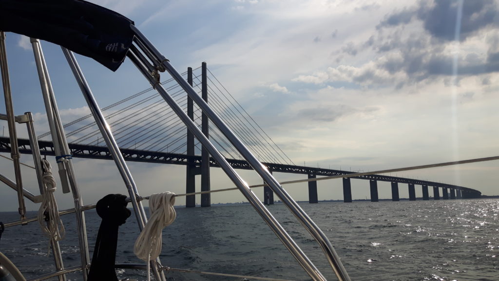 Een prachtige zeildag met een hoeveelheid wind dat we net kunnen “mannen” met volle zeilvoering, al lopen we een aantal keren uit het roer. Zoals op kaartje (track) te zien is het scherp aan de wind en moeten we een stuk laveren. Wanneer we in de buurt van de haven komen zien we de brugpijlers van de beruchte serie “The Bridge” al aan de horizon prijken. Kijken of detective Saga tijd voor ons heeft… 🙂