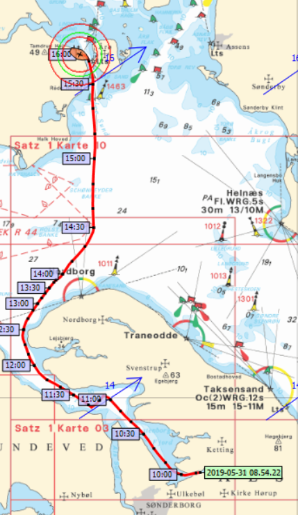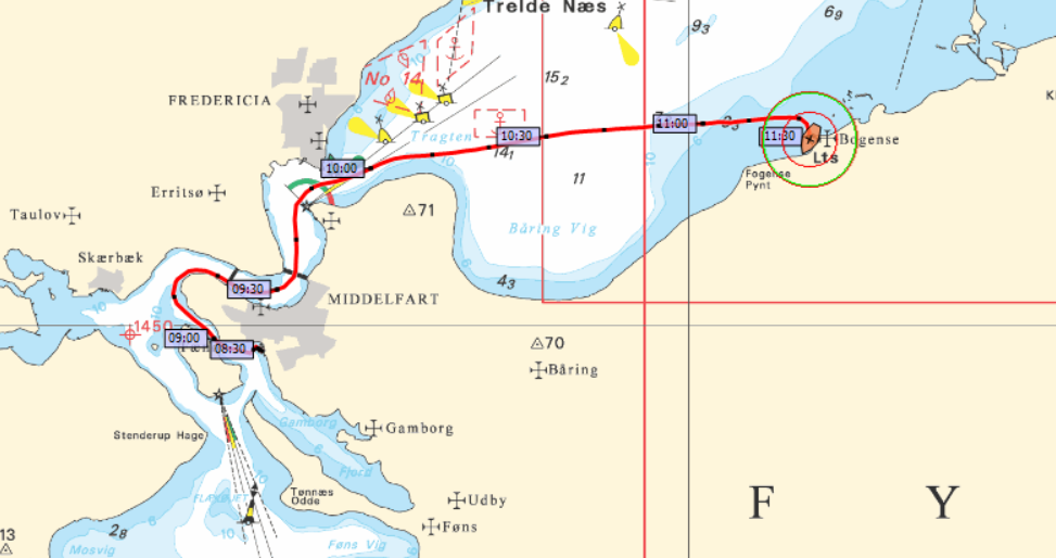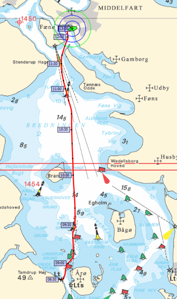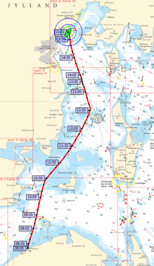 Daarna trossen los, we willen bijtijds in Bogense zijn, kunnen we er nog wat rondsnuffelen. Gelijk buiten de haven de zeilen hijsen en, zie de route, slingerend door de fjord richting Bogense.