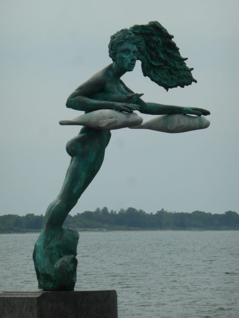 Bij het havenhoofd (de ingang of uitgang van de haven, het is maar hoe je het bekijkt) van Bogense staat dit naar wij wel mogen zeggen bijzondere beeld. Wat het precies moet voorstellen weten we niet. Een fles wijn voor wie ons hier wat meer over kan vertellen.