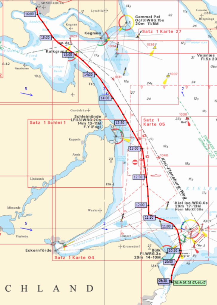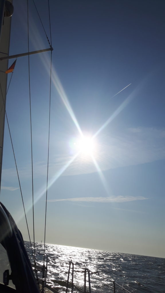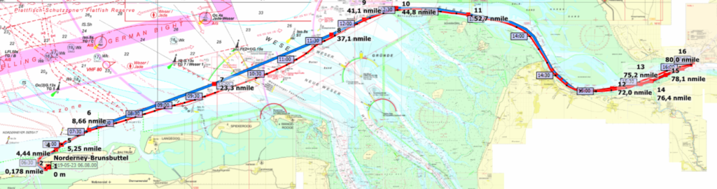 De Elbe opvaren doen we met stroom mee, zo’n 3 knopen. We halen dan soms een snelheid van 11 knopen, laat staan als we deze stroom tegen zouden hebben dan zouden we amper 5 kopen gehaald hebben. Goed kunnen rekenen is dus ook bij het zeilen van groot belang.