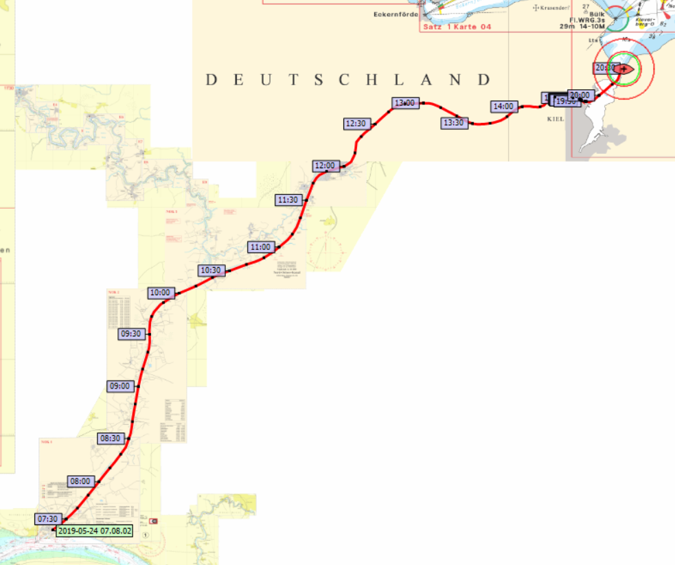 Het is ca 96 km door het Kieler kanaal. Benieuwd wat ons te wachten staat. Zal dit Noord-Oostzeekanaal te vergelijken zijn met ons Noordzeekanaal (21 km lang)? Langs het kanaal staat dmv bordjes elke km aangegeven. We besluiten ieder steeds 10 km sturen voor onze rekening te nemen. ‘Handsturen’ en ‘motor in bedrijf’ is namelijk verplicht op dit kanaal. Miranda houdt Pieter goed in de gaten want hij wil nog wel eens smokkelen 🙂